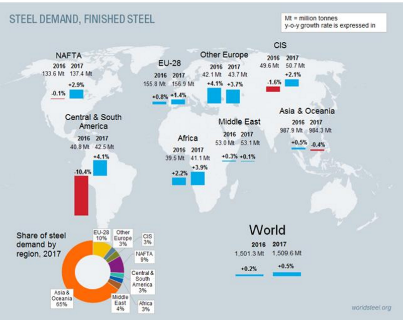 In the U.S., steel demand continues to be weaker than normal, despite the strengthening of the U.S. economy. Worldsteel notes the strong dollar has hurt the manufacturing sector and the downturn in the oil and gas industry continues to be a drag on steel demand.