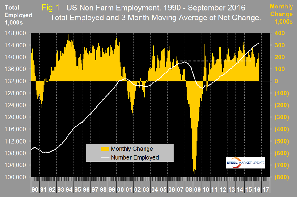 Total employment equals the sum of private and government employees, it also equals the sum of goods producing and service employees. Most of the goods producing employees work in manufacturing and construction and the components of these two sectors that we consider to be of most relevance to steel people are broken out in Table 1. In September, 167,000 jobs were created in the private sector and government lost 11,000. The Federal government gained 4,000 as local governments lost 15,000. This was the first month for local governments to cut employment since November last year. State government’s employment total was unchanged. Since February 2010, the employment low point, private employers have added 15,309,000 jobs as government has shed 295,000. In September, service industries expanded by 146,000 and goods producing industries by 10,000 people. Since February 2010, service industries have added 13,029,000 and goods producing 1,985,000 positions. This is part of the reason for stagnant wage growth since service industries on average pay less than goods producing such as manufacturing.