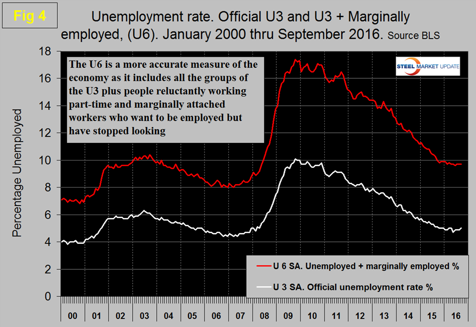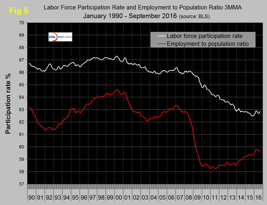 The employment participation rate is widely quoted in the press as going nowhere. In September 2016 the rate was 62.9 percent, with a 3MMA also of 62.8 percent. There was a small improvement from 62.4 percent in September last year to 63.0 percent in March but no progress since then. We’re not sure that we understand what this is a percentage “of” because of the multiple descriptions of the labor pool. Another measure is the number employed as a percentage of the population which we think is much more definitive. In September this measure was up by 0.1 percent at 59.8 percent with a 3MMA of 59.7 percent. There has been a gradual improvement in employment to population ratio since late 2011. Figure 5 shows both measures on one graph.