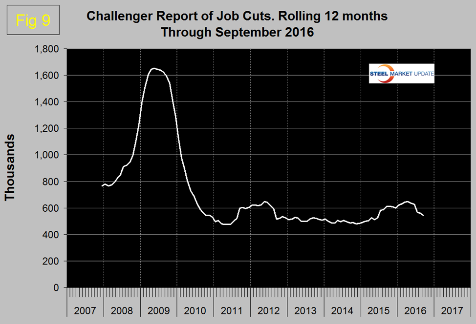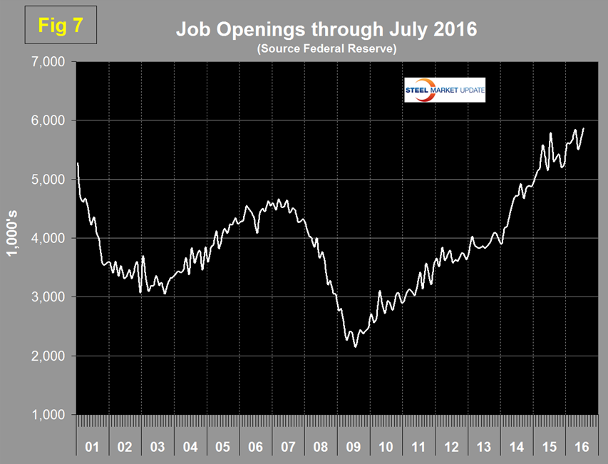 The job openings report known as JOLTS is reported on about the 10th of the month by the Federal Reserve and is over a month in arrears. Figure 7 shows the history of unfilled job openings through July when openings stood at 5,871,000 an all-time high. There has been an improving trend throughout 2016.