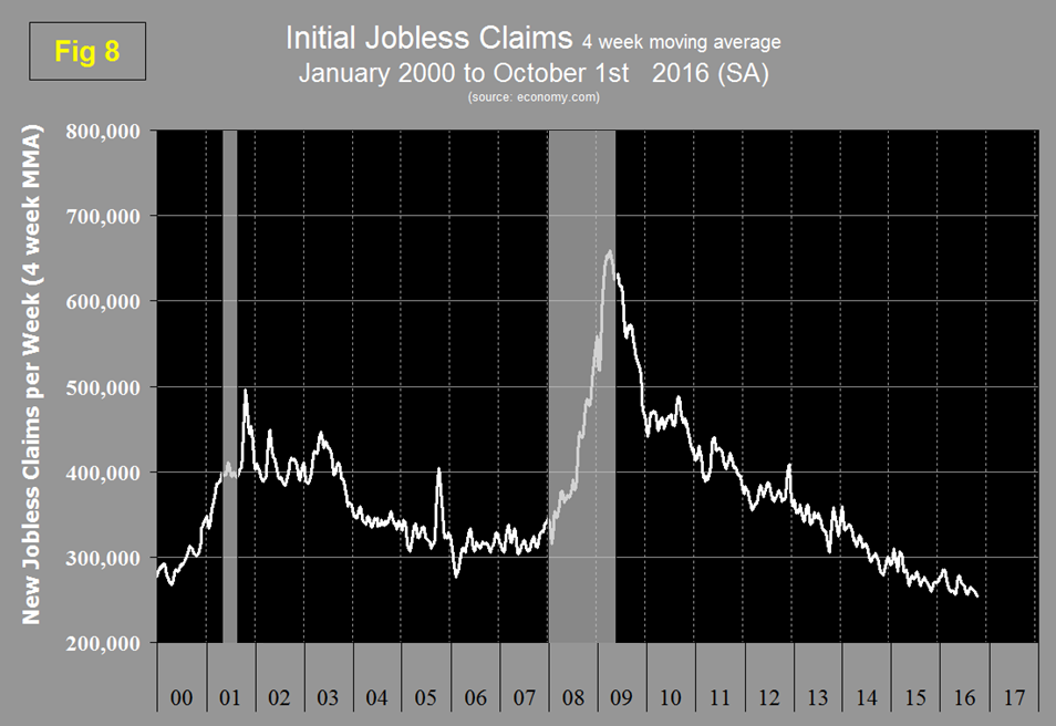 Initial claims for unemployment insurance, reported weekly by the Department of Labor have continued their downward drift this year and in w /e October 1st were 253,500 on a four week moving average basis. This marks the longest streak since 1973 of initial claims below 300,000. (Figure 8).