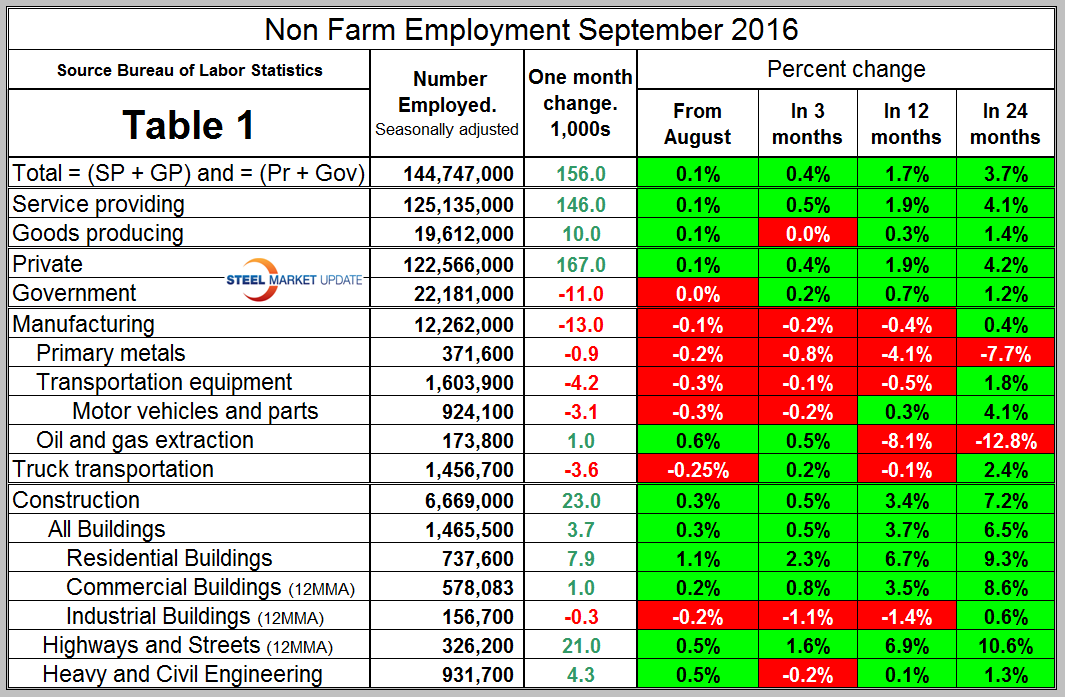 In September, manufacturing lost 13,000 jobs and for the year as a whole is down by 58,000. August and September had a combined loss of 29,000 following small gains in June and July. In September total manufacturing employment was 0.4 percent less than a year ago but 0.4 percent higher than two years ago. Primary metals have had only one month of positive job growth in the last 20 months and have lost 4.1 percent in the last year and 7.7 percent in two years. Table 1 shows that in September oil and gas extraction had an employment gain of 1,000 people following the same gain in August. These last two months were the first back to back months of gains since September and October 2014. Truck transportation lost 3,600 positions in September and is down by 7,100 YTD. Note the subcomponents of both manufacturing and construction shown in Table 1 don’t add up to the total because we have only included those that we think have most relevance to the steel industry.