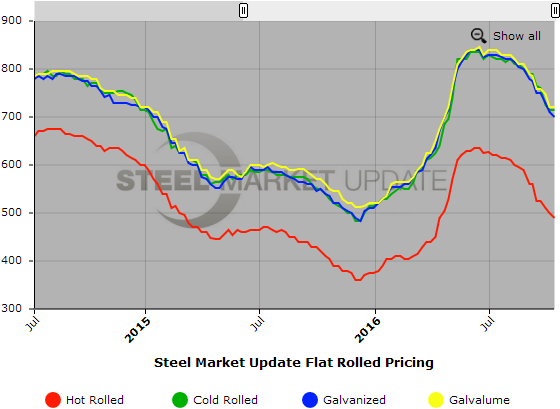SMU Note: Below is a graphic showing our hot rolled, cold rolled, galvanized, and Galvalume price history. To use the graphs interactive capabilities, you must view it on our website here. If you need help navigating the website or need to know your login information, contact us at info@SteelMarketUpdate.com or by calling 800-432-3475.