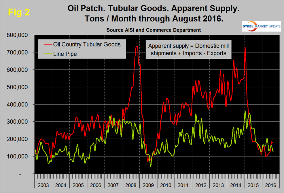 Figure 2 shows the apparent supply of the two main steel tubular products used in oil and gas production from January 2003 through August 2016 (Apparent supply is a proxy for demand.)