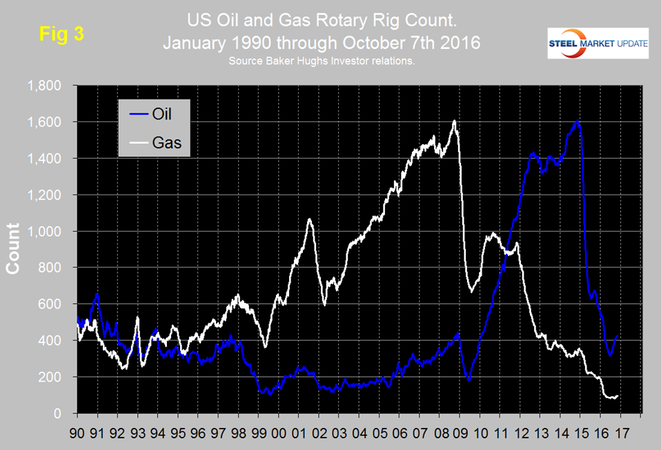 The total number of operating rigs in the US and Canada on October 7th was 687, up from a low of 445 on May 27th. In that time frame the oil rig count was up from 330 to 515 and the gas count was up from 115 to 172. Figure 3 shows the Baker Hughes US Rotary Rig Counts for oil and gas equipment in the US through October 7th (explanation below).