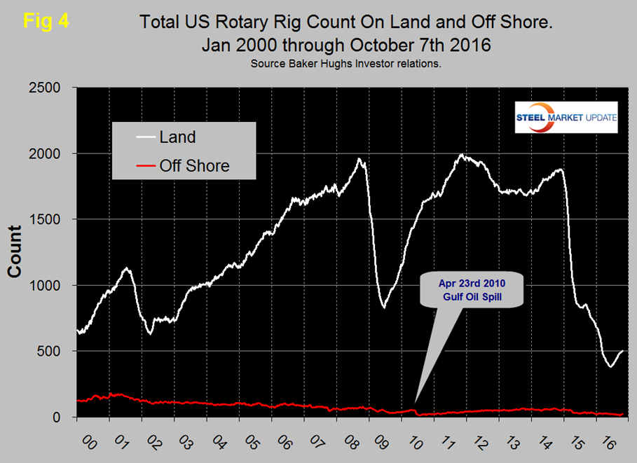 The uptick in the US oil rig count was the first since August of last year and now seems to be well established having increased from 316 on May 27th to 428 on October 7th. Based on the most recent available data, the EIA estimates that oil production from hydraulically fractured wells now makes up about half of total U.S. crude oil production. The off shore US rig count peaked at 66 on August 29th 2014 immediately before the oil price crash. Since then the off shore count steadily declined to 10 on September 2nd before recovering to 23 on October 7th.