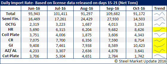 The U.S. Department of Commerce updated foreign steel import license data earlier today. SMU analyzes the license data through the 18th of October, produces a daily import license request rate and then we make an assumption that if the daily rate continues by the end of the month we will have “X” number of tons to potentially be received into the United States during the month.
