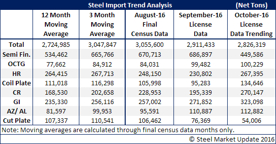 In the table below we show our 12 month and 3 month moving averages as well as August (Final Census Data), September (license data updated through today) and October (license data). October is trending toward a 2.8 million net ton month with the largest decreases being semi-finished and CTL plate as described above.