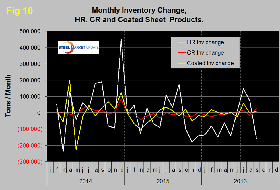 Total sheet inventory tonnage has been in decline since the beginning of 2015 with a bit of an uptick in the last two months. Figure 10 shows the change in inventory monthly for the big 3 sheet products.