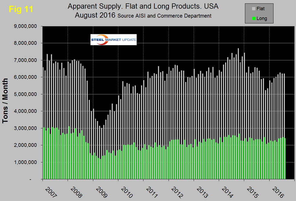 SMU Comment: In Figures 2, 4, 5 and 6, the white lines show t/d shipments. There was a decline in shipments for carbon steel products in total in 2015 but this year the decline has slowed. Figure 11 shows the total supply to the market of long and flat products based on AISI shipment and import data.
