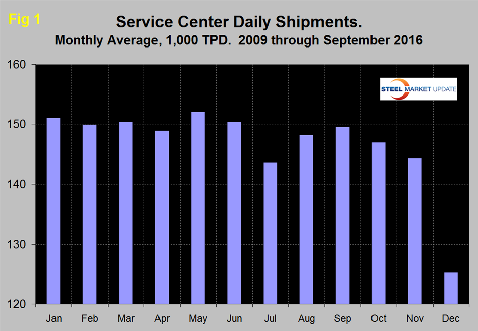 Total service center carbon steel shipments decreased by 1,800 tons on a per day basis from 139,700 in August to 137,900 in September, a decrease of 1.3 percent. In the eight years since and including 2009, September t/d shipments on average have been up by 0.9 percent from August. Therefore this September was disappointing. This observation is intended to give a long term perspective because MSCI data is quite seasonal and we need to get past that before commenting in detail on current results. Figure 1 demonstrates this seasonality and why comparing a month’s performance with the previous month is usually misleading.
