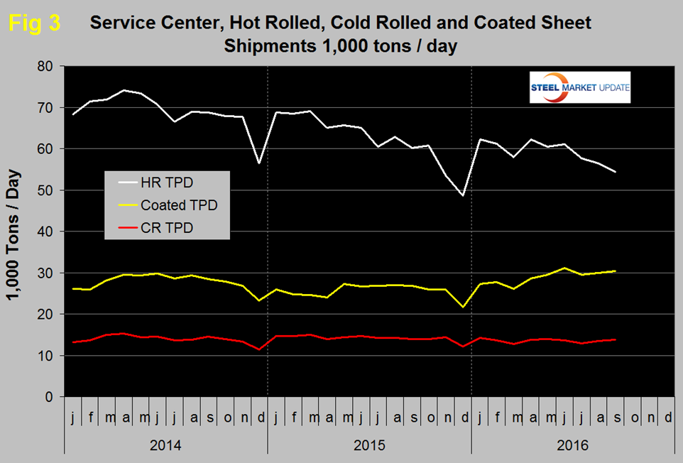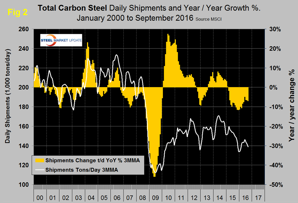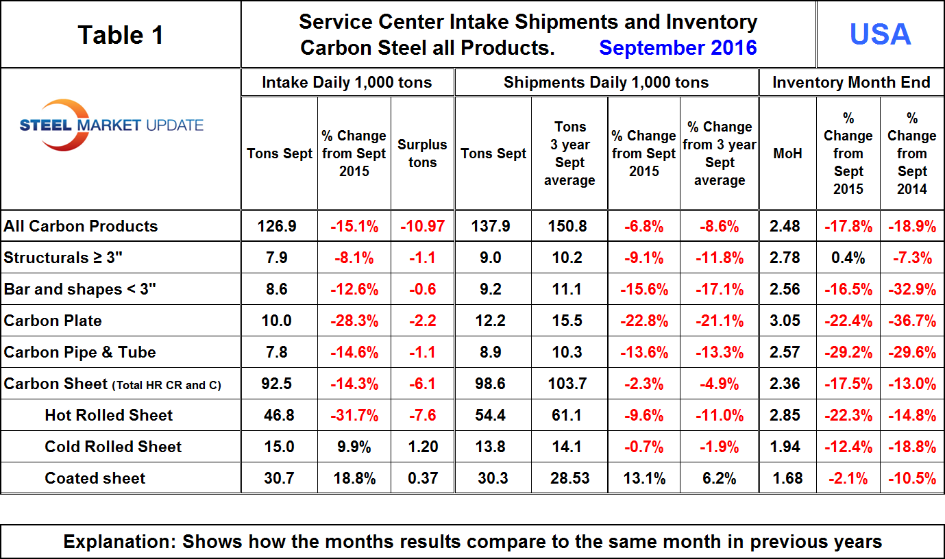 History tells us that we can expect t/d shipments to decrease in October and November and to collapse in December. In the SMU analysis we always consider year over year changes to eliminate seasonality. Table 1 shows the performance by product in September compared to the same month last year and also with the average t/d shipments for this and the two previous months of September. We then calculate the percent change between September 2016 and September 2015 and with the 3 year September average. Our intention is to provide an undistorted view of market direction.