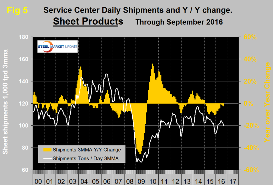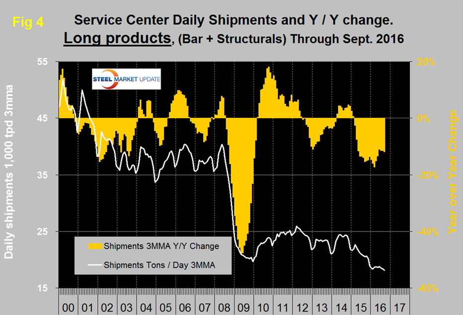 Shipments of all carbon steel products in September on a t/d basis were down by 6.8 percent y/y and were 8.6 percent less than the average September shipments for 2016, 2015 and 2014. The fact that the single month y/y growth comparison is slightly better than the three year comparison suggests that there is slight positive momentum. Figure 2 shows the long term trends of daily carbon steel shipments since 2000 as three month moving averages (in our opinion the quickest way to size up the market is the brown bars in Figures 2, 4, 5 and 6 which show the y/y change in shipments. All four of these graphs show a y/y contraction.)