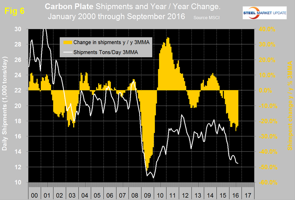 In previous reports we have combined sheet and plate as total flat rolled but these two categories have diverged so much in 2016 that it no longer makes sense to combine them. Sheet and plate products both had a good post-recession recovery. Both had some contraction in 2013 and growth in 2014 but since early 2015 they have diverged dramatically to the point that in September y/y sheet was down by 2.3 percent as plate was down by 22.8 percent. Figures 5 and 6 show the 3MMA of t/d shipments and the y/y growth for each. In 2006 and 2007, the mills and service centers were operating at maximum capacity.