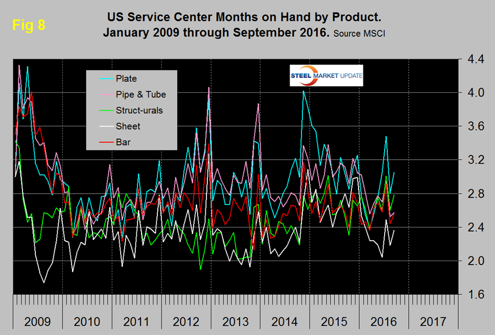 September closed with months on hand (MoH) of 2.48 for all carbon steel products, up from 2.30 in August. All products except structurals and coated sheet had a double digit y/y decrease in inventory tonnage and tubulars were down by 29.2 percent. Figure 8 shows the MoH by product monthly since January 2009.
