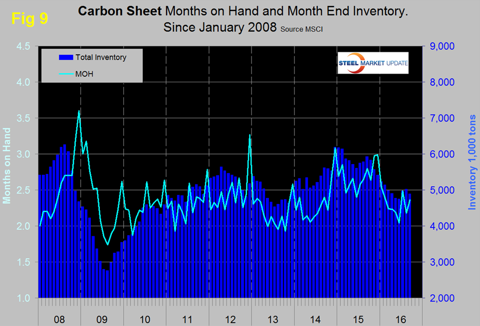 All products had a surge in months on hand in July driven not by an inventory volume increase but by a decrease in monthly shipments as a result of a small number of shipping days. Figure 9 shows both the monthly inventory and months on hand since January 2008 for total sheet products.