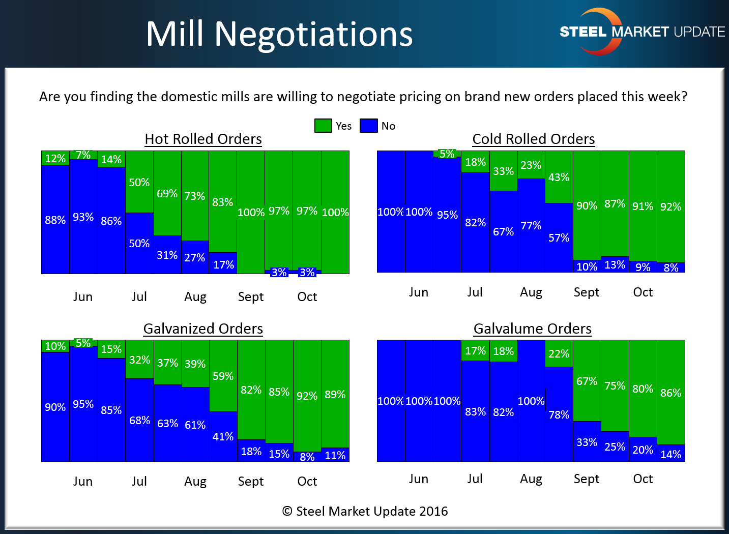 Cold rolled is not quite unanimous but with 92 percent of the respondents reporting the mills as willing to negotiate CRC pricing, it might as well be. You have to go back to mid-August to see less than 50 percent of our respondents reporting spot prices as negotiable.