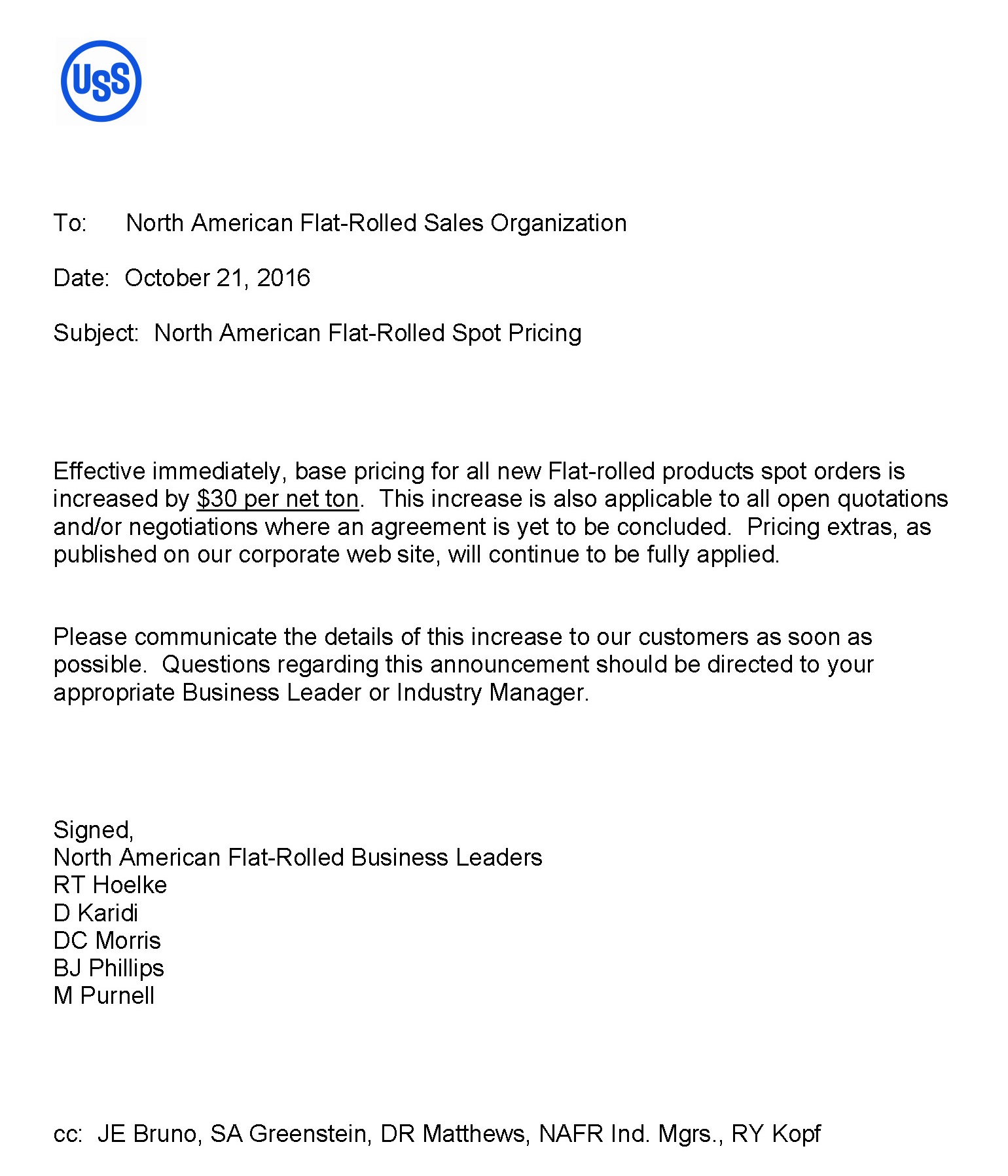 On October 21, 2016 US Steel announced a $30 per ton price increase on all flat rolled steel products (hot rolled, cold rolled, galvanized, Galvalume) effective immediately. According to the US Steel letter (copy shown below) the increase is to be applied to all spot orders where quotations and negotiations have not yet been completed.