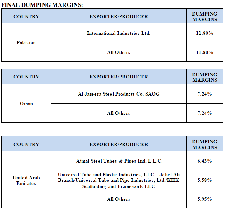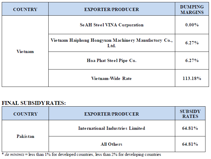 On Monday, the U.S. Department of Commerce (Commerce) announced its affirmative final determinations in the antidumping investigations of imports of circular welded carbon-quality steel pipe from Pakistan, Oman, the United Arab Emirates, and Vietnam, and the countervailing investigation of imports of the same merchandise from Pakistan.