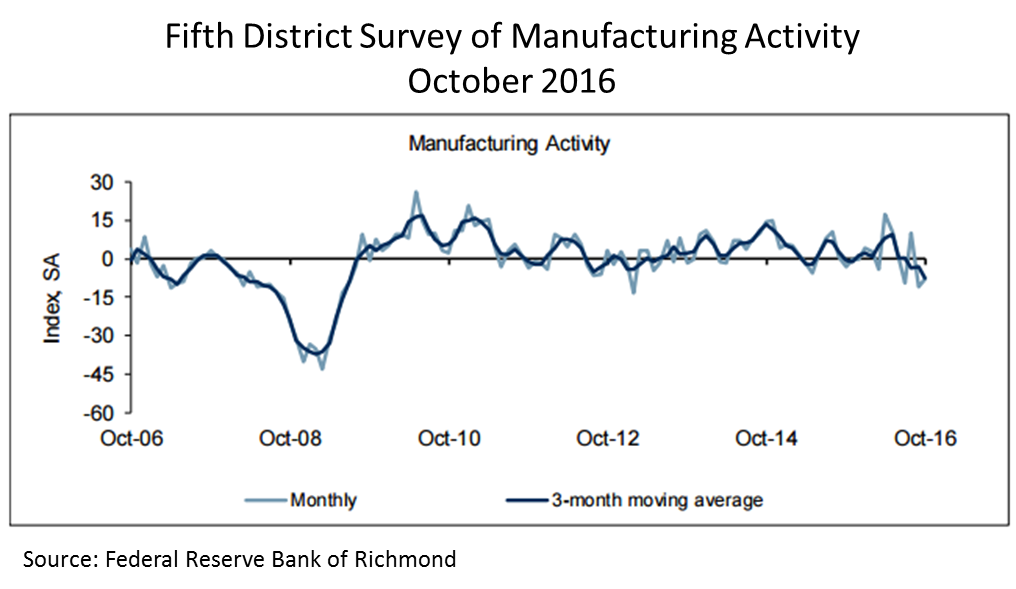 Manufacturing activity in the Fifth District slowed in October according to the Survey of Manufacturing Activity produced by Federal Reserve Bank of Richmond. The composite Index registered -4, improving from -8 in September and -11 in August.