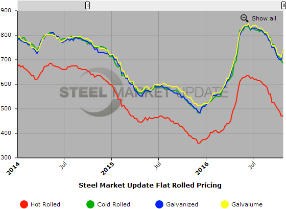 SMU Note: Below is a graphic showing our hot rolled, cold rolled, galvanized, and Galvalume price history. To use the graphs interactive capabilities, you must view it on our website here. If you need help navigating the website or need to know your login information, contact us at info@SteelMarketUpdate.com or by calling 800-432-3475.