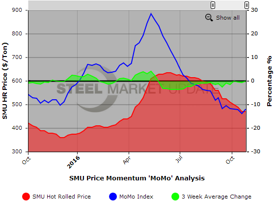 The Steel Market Update (SMU) Price Momentum Index (MoMo) for hot rolled steel in the United States remained negative this week for the 15th consecutive week, following a 28 week long positive streak. MoMo is a trailing indicator and shows the relationship between the current U.S. hot rolled coil price movements against the previous 12-week average price as a percentage. A positive MoMo index indicates hot rolled steel prices are moving in an upward direction compared to the previous 12 week period, while a negative index number indicates a downward direction in prices.