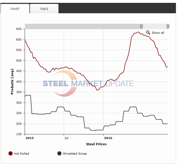 By the way, for those who don’t go to our website very often, the above graphic came directly from the Interactive Steel Pricing Tool on our website. Once you log into the website go to the “Prices” tab. A drop down menu will appear and you click on “Steel Prices” to get to the Interactive Steel Pricing Tool. There, you can click on the product (or products) you wish to see prices for. You can also adjust the length of time you want to see. In the graphic above I clicked on Hot Rolled and then I added Shredded Scrap by using the Control (Ctrl) button and clicking on the item at the same time. I then set the data to be used as “Weekly” even though we only produced our scrap numbers on a monthly basis. I set the time frame using the bar at the top of the graphic. If you want to see the actual data you can hover over the lines on the graphic and the numbers will be exposed. You can also go to a “Table” version of the data which shows all of the data behind the chart.