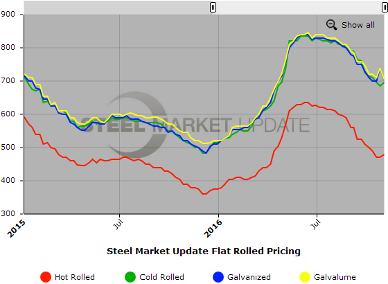SMU Note: Below is a graphic showing our hot rolled, cold rolled, galvanized, and Galvalume price history. To use the graphs interactive capabilities, you must view it on our website here. If you need help navigating the website or need to know your login information, contact us at info@SteelMarketUpdate.com or by calling 800-432-3475.