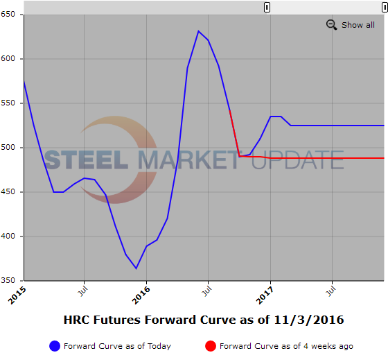 The futures curve in Cal’17 has been relatively flat for the past week about $30 above the levels of the recent price increase announcements.($525/ST)
