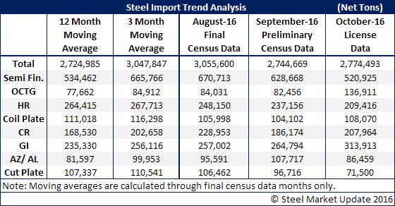 Imports of foreign steel came in at 2,744,669 net tons for the month of September based on the U.S. Department of Commerce Preliminary Census Data while October is trending at almost the exact same number with 2,774,493 net tons of foreign steel import license requests as of the 1st day of November.