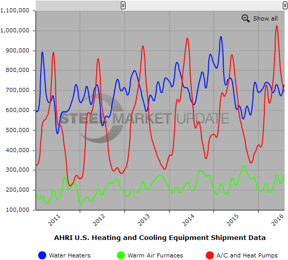 Below is a graph showing the history of water heater, warm air furnace, and air conditioner shipments. You will need to view the graph on our website to use it’s interactive features, you can do so by clicking here. If you need assistance with either logging in or navigating the website, please contact our office at 800-432-3475 or info@SteelMarketUpdate.com.