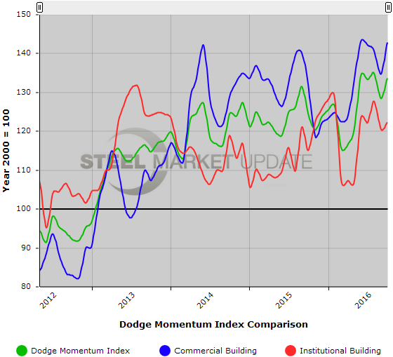 Below is a graph showing the history of the Dodge Momentum Index. You will need to view the graph on our website to use its interactive features, you can do so by clicking here. If you need assistance logging into or navigating the website, please contact our office at 800-432-3475 or info@SteelMarketUpdate.com.