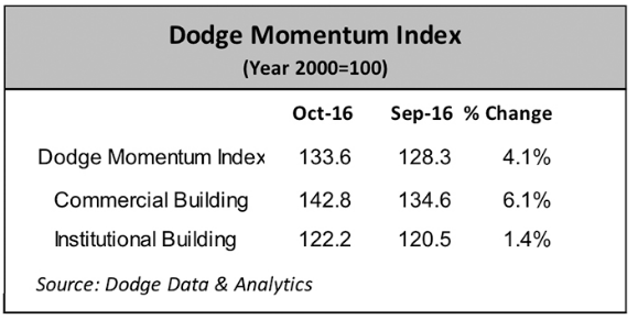 Nonresidential construction planning took a jump in October, according to the latest survey by Dodge Data and Analytics. The Dodge Momentum Index grew 4.1 percent in October to 133.6, nearly reversing September’s loss.