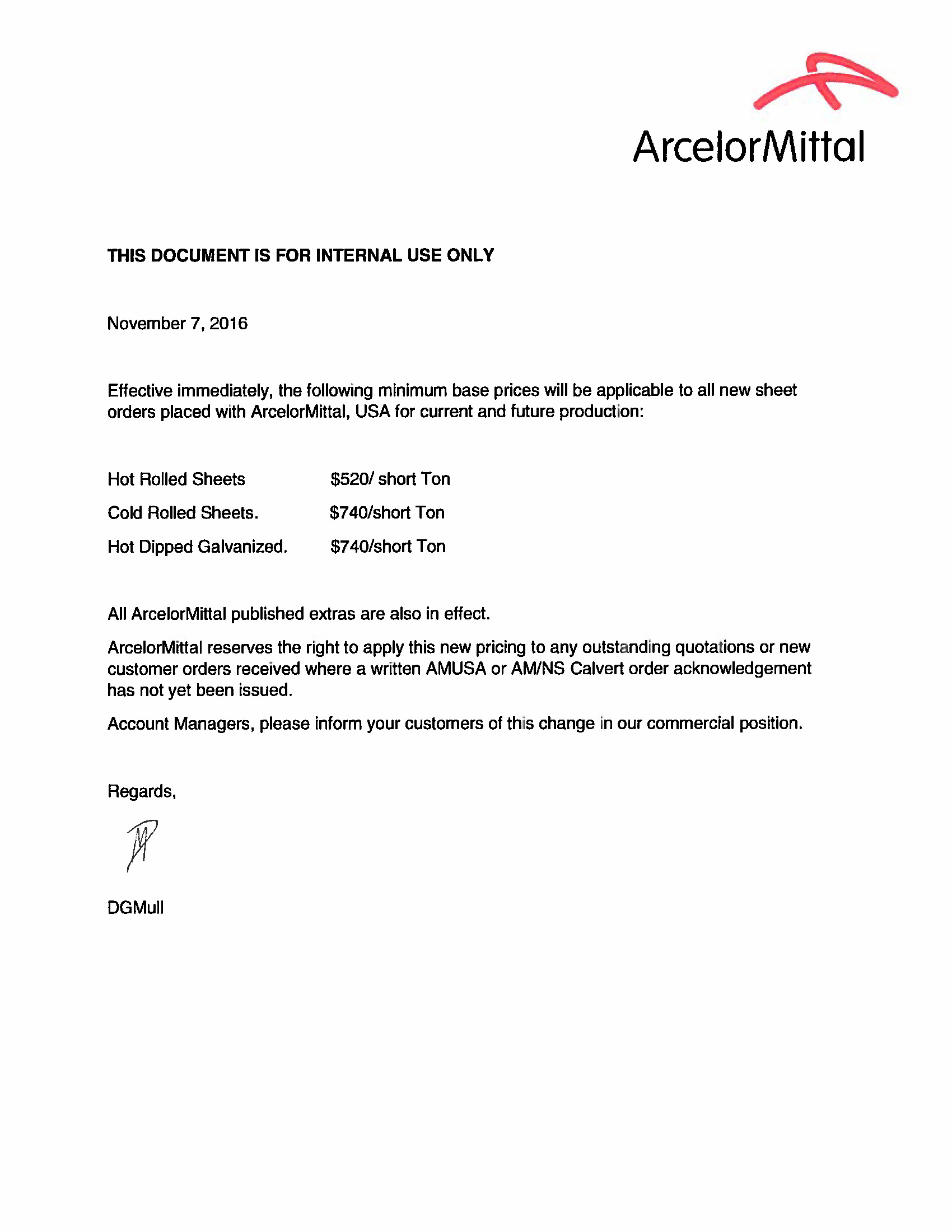 On Monday, November 7, 2016 ArcelorMittal USA began advising their customers of their intention of raising steel base prices to specific minimum levels. The announcement came from an internal memo (or email from the various sales representatives of the mill) which stated, “Effective immediately, the following minimum base prices will be applicable to all new sheet orders placed with ArcelorMittal, USA for current and future production:”