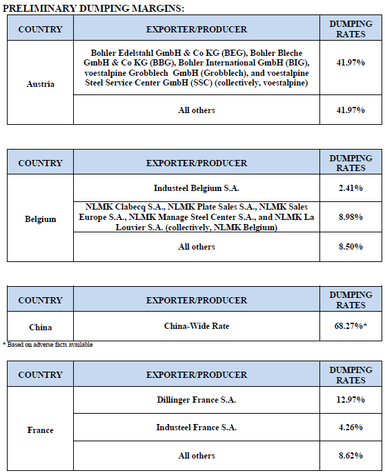 The Department of Commerce announced on Monday its affirmative preliminary determinations in the antidumping investigations of imports of certain carbon and alloy steel cut-to-length plate (CTL plate) from Austria, Belgium, China, France, Germany, Italy, Japan, Korea, and Taiwan.