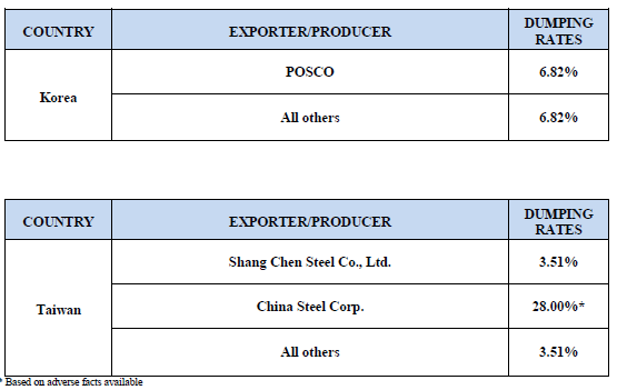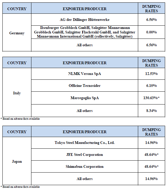 Dumping margins were assigned based on adverse facts available due to failure to cooperate for Marcegaglia SpA in Italy, JFE Steel Corporation and Shimabun Corporation in Japan, and for China Steel Corporation in Taiwan. In the China investigation, Commerce found that sole mandatory respondent, Jiangyin Xingcheng Special Steel Works Co., Ltd., is not eligible for a separate rate from the China-wide entity which received a preliminary dumping margin of 68.27 percent for failure to cooperate.