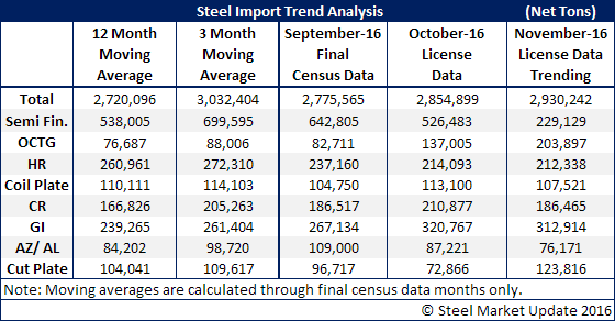The U.S. Department of Commerce (DOC) released Final Census Data on imports of foreign steel for the month of September 2016. Imports totaled 2,775,565 net tons which is 9.5 percent below the August import numbers. The U.S. continues to see strong imports of semi-finished steels (slabs/billets) which are used by the domestic steel mills. Hot rolled was down from both the 12 month and 3 month moving averages as was coiled plate and cut plate. OCTG and cold rolled were below the 3MMA but above the 12MMA. Both galvanized and Galvalume were above both the 12MMA and 3MMA.