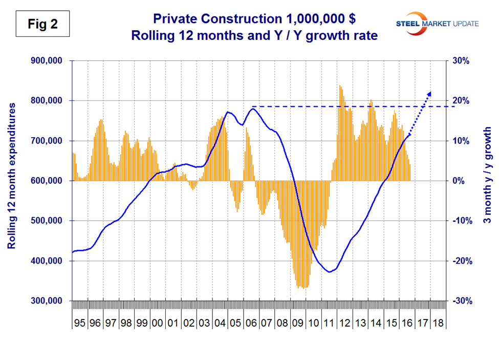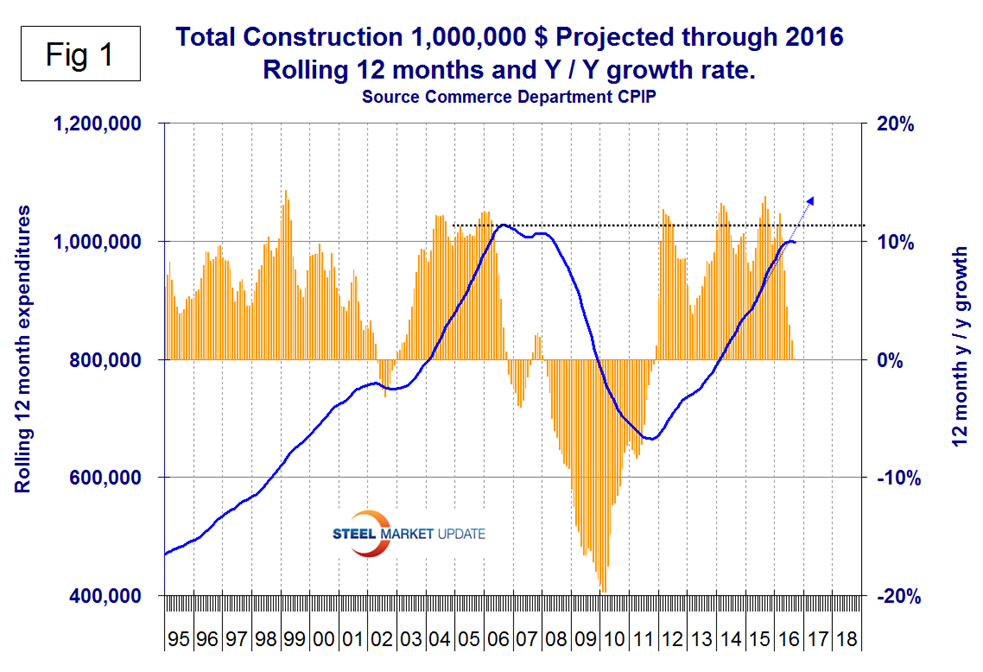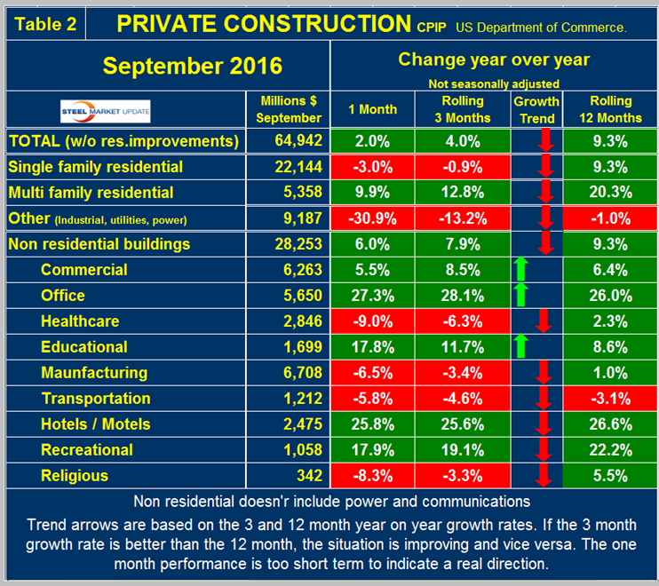 The official CPIP press release gives no appreciation of trends on a historical basis and merely compares the current month with the previous one on a seasonally adjusted basis. The data is provided as both seasonally adjusted and non-adjusted. The detail is hidden in the published tables which we at SMU track and dissect to provide a long term perspective. Our intent is to provide a rout map for those subscribers who are dependent on this industry to “Follow the money.” This is a very broad and complex subject therefore to make this monthly write up more comprehensible we are keeping the information format as consistent as possible. In our opinion the absolute value of the dollar expenditures presented are of little interest. What we are after is the magnitude of growth or contraction of the various sectors. In the SMU analysis we consider only the non-seasonally adjusted data. We eliminate seasonal effects by comparing rolling three month expenditures year over year. CPIP data also includes the category of residential improvements which we have removed from our analysis in the rational that such expenditures are minor consumers of steel.