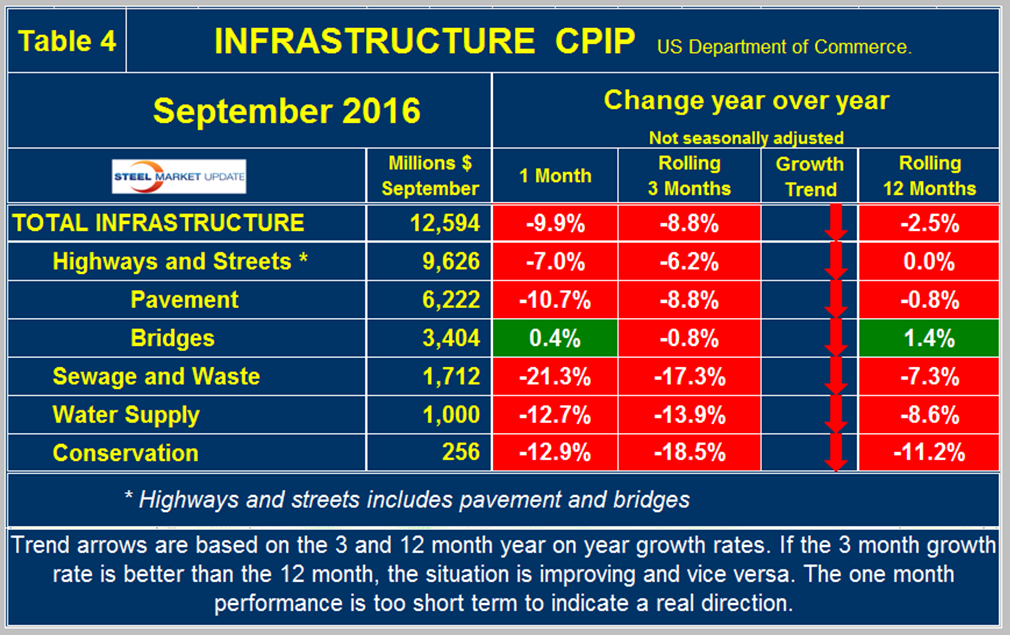 Expenditures have contracted for six straight months through September when growth was negative 8.8 percent. Prior to June there was a string of 34 out of 35 months with positive growth. Growth has slowed from a nine year high of positive 10.0 percent in March this year. Highway and streets including pavement and bridges account for about 2/3 of total infrastructure expenditures and had positive growth every month since September 2013 before contracting by 4.2 percent in June, 6.5 percent in July, 7.7 percent in August and 8.4 percent in September this year. All infrastructure segments had negative growth in three months through September y/y. Highway pavement is the main subcomponent of highways and streets and had a 6.2 percent negative growth in three months through September. Bridge work had negative growth of 0.8 percent in September (Table 4).