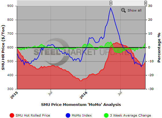 To get a wider sense of the change in the MoMo Index and eliminate weekly fluctuations, we calculate a 3-week average change. The 3-week average change in the MoMo Index is +3.30 percent, following a change of +1.26 percent the week before and +0.01 two weeks ago. This also shows that there is an positive movement in hot rolled price momentum and that movement is accelerating. Readers should note that this is the third consecutive positive 3-week average change since May 2016.