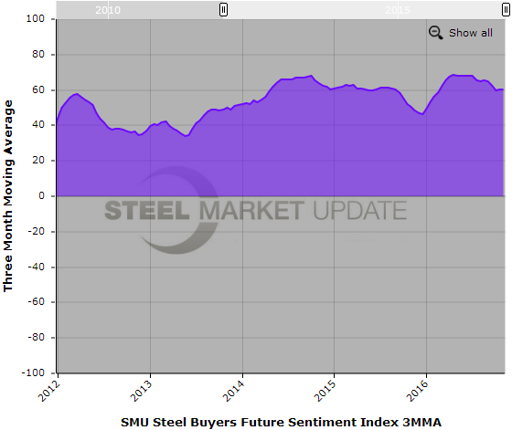 The trend line for Current Sentiment has our respondents as being less optimistic. The trend began in early July 2016 and we believe we could get one more down stroke before Sentiment bottoms and moves back up. We feel the market trends to react to a change in flat rolled prices as a good thing and, thus, more optimistic for their company’s ability to be successful in the current market environment.