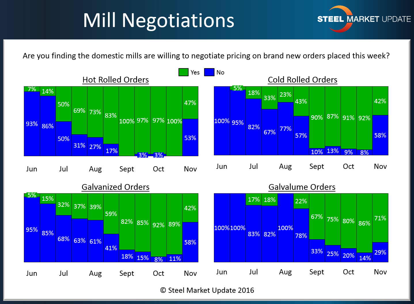 Hot rolled coil had 97-100 percent of our survey respondents reporting the mills as negotiating on pricing during the months of September and October. Now in early November we have seen those reporting that way dropping to 47 percent.