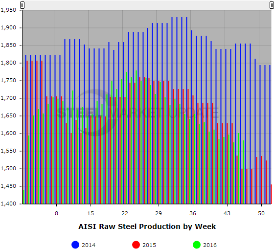 SMU Note: Below is a graphic showing the weekly raw steel production history. To use the graphs interactive capabilities, you must view it on our website. You can do this by clicking here. If you need help navigating the website or need to know your login information, contact us at info@SteelMarketUpdate.com or by calling 800-432-3475.
