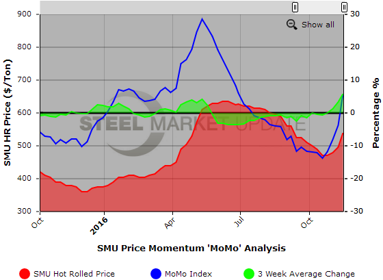 MoMo was measured at 5.80 percent this week, meaning that the current HRC price is now higher than the average price over the last 12 weeks.
