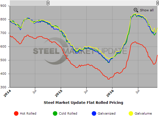 SMU Note: Below is a graphic showing our hot rolled, cold rolled, galvanized, and Galvalume price history. To use the graphs interactive capabilities, you must view it on our website here. If you need help navigating the website or need to know your login information, contact us at info@SteelMarketUpdate.com or by calling 800-432-3475.