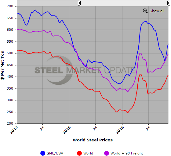 The SteelBenchmarker world export price for hot rolled bands is $406 per net ton ($448 per metric ton) FOB the port of export according to data released by SteelBenchmarker on Monday November 14th. This is up $28 per ton from the previous release on October 24th and up $44 per ton over the October 10th release. Adding in $90 in estimated import costs, that puts prices around $496 per ton delivered to the US.