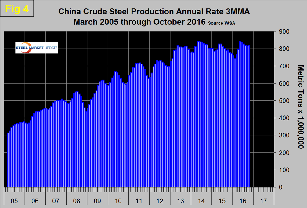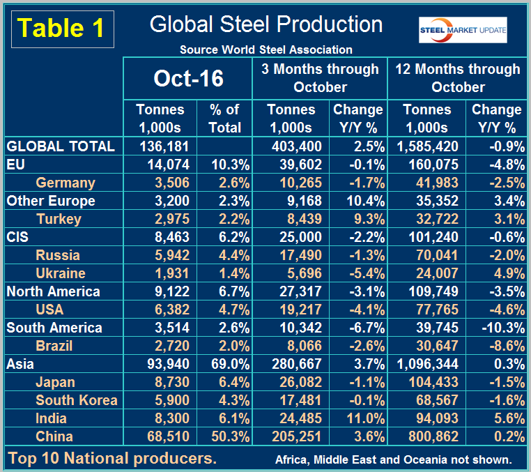 SMU Comment: Evidently China is picking up the pace again as the rest of the world has contracted for 18 straight months through July and experienced 0.4 percent growth in August, 0.8 percent in September and 1.4 percent in October. Most of the ROW growth occurred in Turkey and India. With a global capacity utilization of 69.6 percent in October it is evident that capacity reductions have a long way to go before they begin to reduce the market pressure of over production. According to the OECD, capacity will continue to increase through 2018. To make matters worse, global economic growth is slowing and the Chinese currency is weakening. We repeat what we have said before and still believe, that oversupply and low capacity utilization won’t be resolved until well into the next decade. The forecast of a 3.0 percent demand increase in the US next year is optimistic based on the IMF forecast for US GDP growth in 2017.
