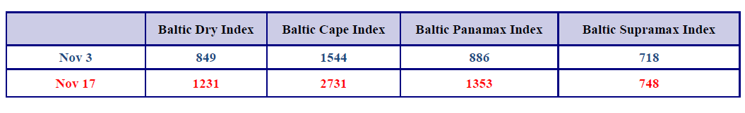 The dry-bulk market continued its advance through November, reaching a reading of 1000 for the Baltic Dry Index on November 11 and jumping to 1231 on November 17. As a reference point the BDI was at 849 at the beginning of the month (Nov. 3). The BDI tracks dry-bulk rates based on vessel size and shipping route and is a used as a benchmark for overall trade volume.