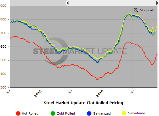 SMU Note: Below is a graphic showing our hot rolled, cold rolled, galvanized, and Galvalume price history. To use the graphs interactive capabilities, you must view it on our website here. If you need help navigating the website or need to know your login information, contact us at info@SteelMarketUpdate.com or by calling 800-432-3475.