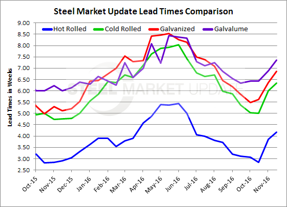 Cold rolled lead times are now averaging 6.35 weeks, up .35 weeks from the beginning of the month. In mid-October lead times were 5.0 weeks and one year ago they were less than 5 weeks (4.75 weeks).